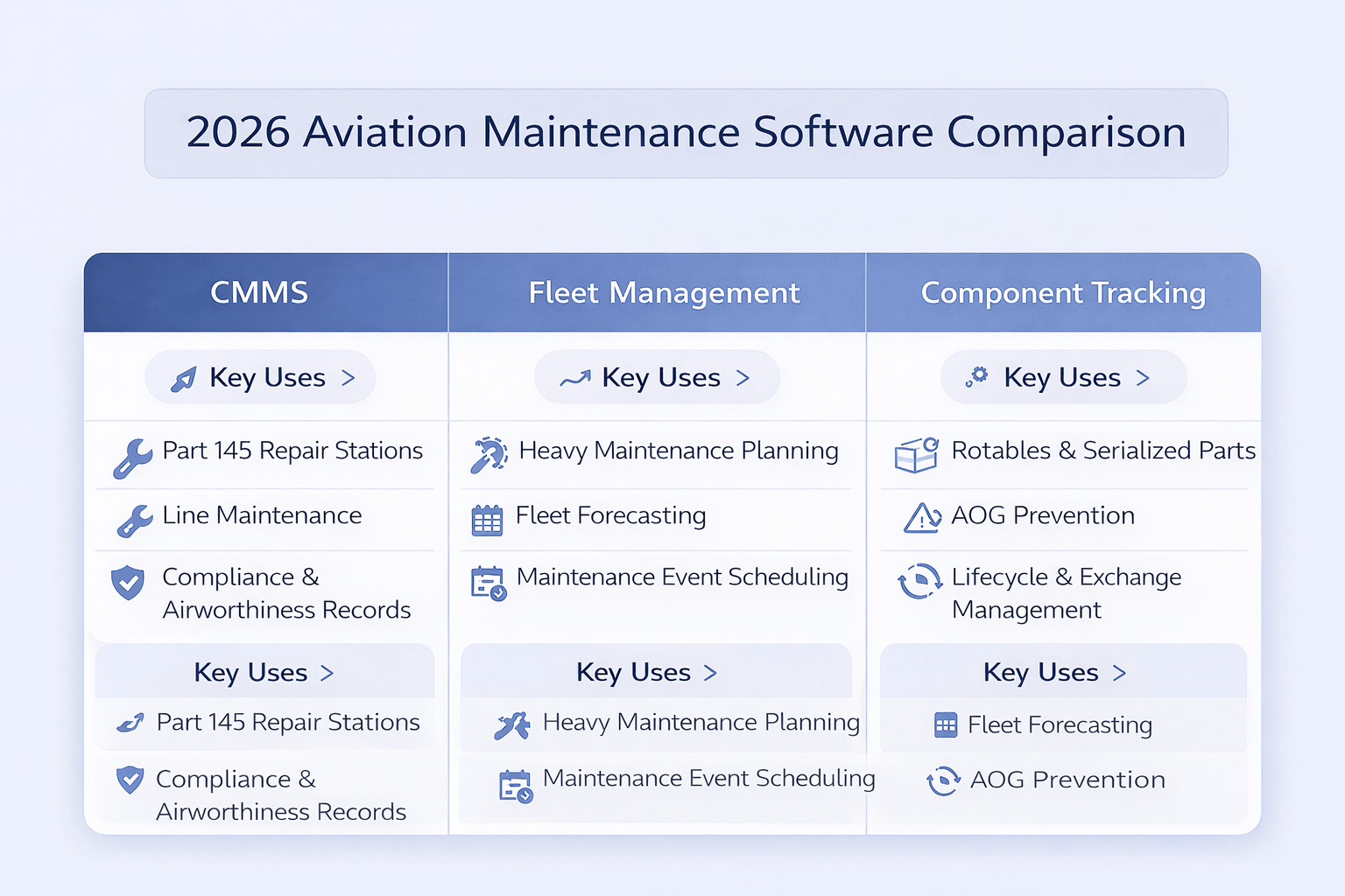 The 2026 reality is different. Modern aviation maintenance software has evolved into specialized solutions that address specific operational needs: CMMS platforms for maintenance tracking, inventory optimization tools, regulatory compliance automation, and predictive maintenance analytics. The organizations winning today aren't using one massive system—they're orchestrating best-of-breed solutions that actually talk to each other.