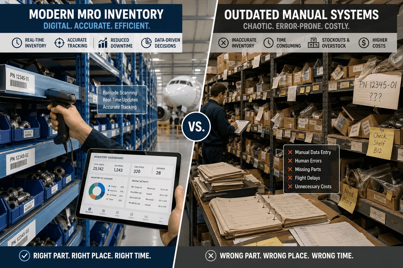 The financial impact is staggering. Industry analysis consistently shows that MROs waste 15-25% of their parts budget on excess inventory, expedited shipping for parts already in-house, and write-offs of time-expired components that weren't tracked properly. For a mid-sized MRO managing $10 million in inventory, that's potentially $2.5 million evaporating annually.